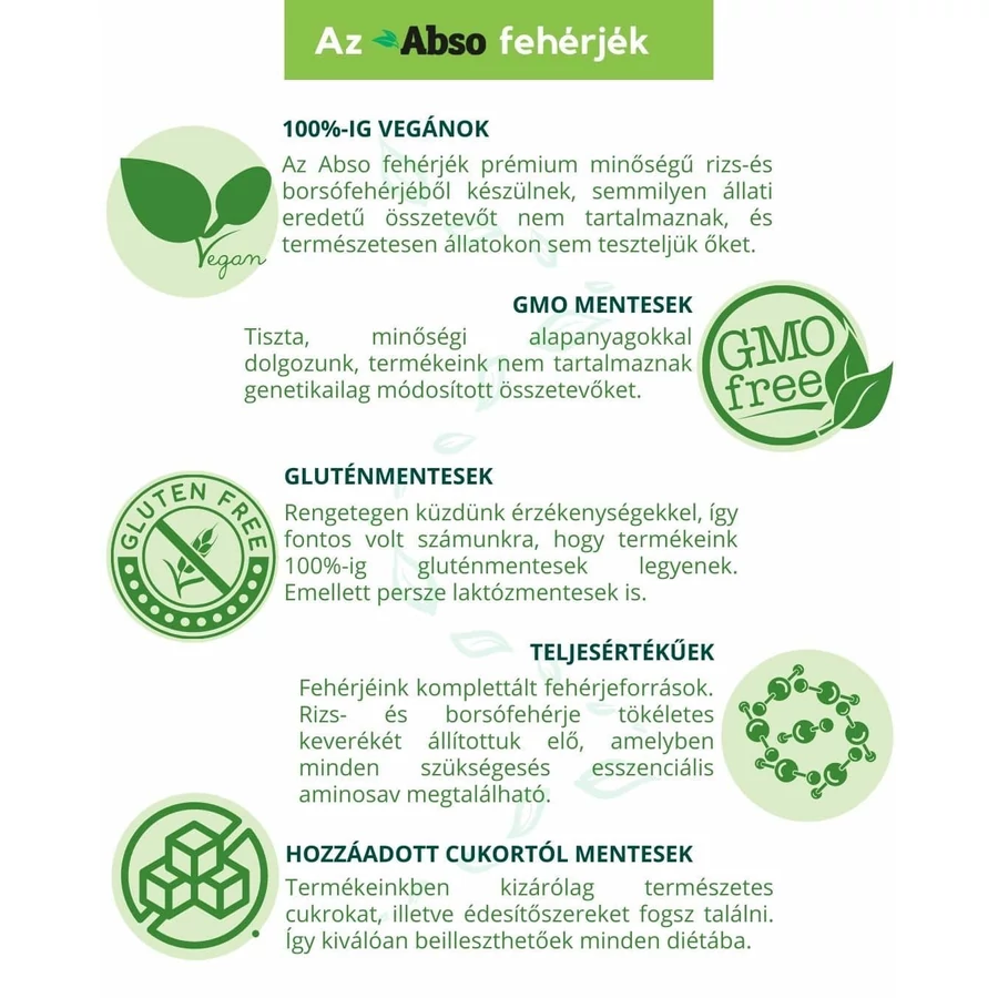 A csokoládé ízesítésű AbsoRICE teljes értékű fehérjeforrás, így ugyanolyan fehérje minőséget biztosít, mint az állati eredetű fehérjék, csak növényi forrásból. A hagyományos fehérjeporoktól eltérően nem tartalmaz hozzáadott cukrot, glutént és tejet sem, így akár speciális étrendekbe is beilleszthető. Hozd ki magadból a legtöbbet kompromisszumok nélkül!