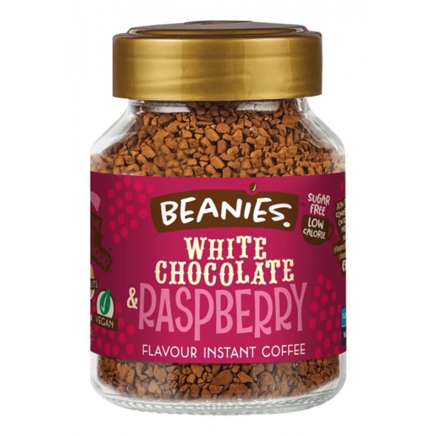 Beanies instant kávé fehércsokis málna ízesítéssel. Mindössze 2 összetevőt tartalmaz: liofilizált kávé és aroma, semmi cukor vagy felesleges adalék. A Beanies instant kávék nem tartalmaznak nyomokban sem jelölendő allergéneket és cukrot. Egy elkészített kávé mindössze 2 kalóriát tartalmaz. A kávé szerelmesei gondtalanul ihatják ezt a kávét még akkor is, ha ételérzékenyek, vegánok, vagy cukorbetegek.