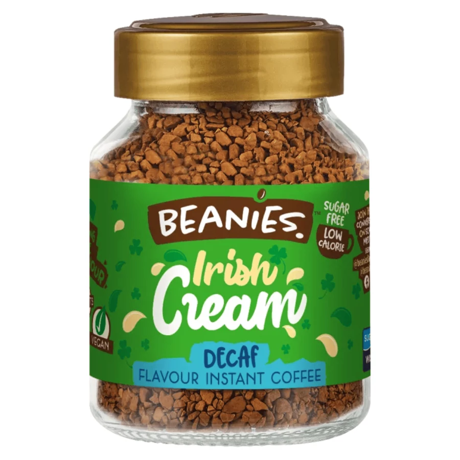 Beanies koffeinmentes instant kávé ír krémlikör ízesítéssel. Mindössze 2 összetevőt tartalmaz: liofilizált koffeinmentes kávé és aroma, semmi cukor vagy felesleges adalék. A Beanies instant kávék nem tartalmaznak nyomokban sem jelölendő allergéneket és cukrot. Egy elkészített kávé mindössze 2 kalóriát tartalmaz. A kávé szerelmesei gondtalanul ihatják ezt a koffeinmentes kávét még akkor is, ha ételérzékenyek, vegánok, vagy cukorbetegek.