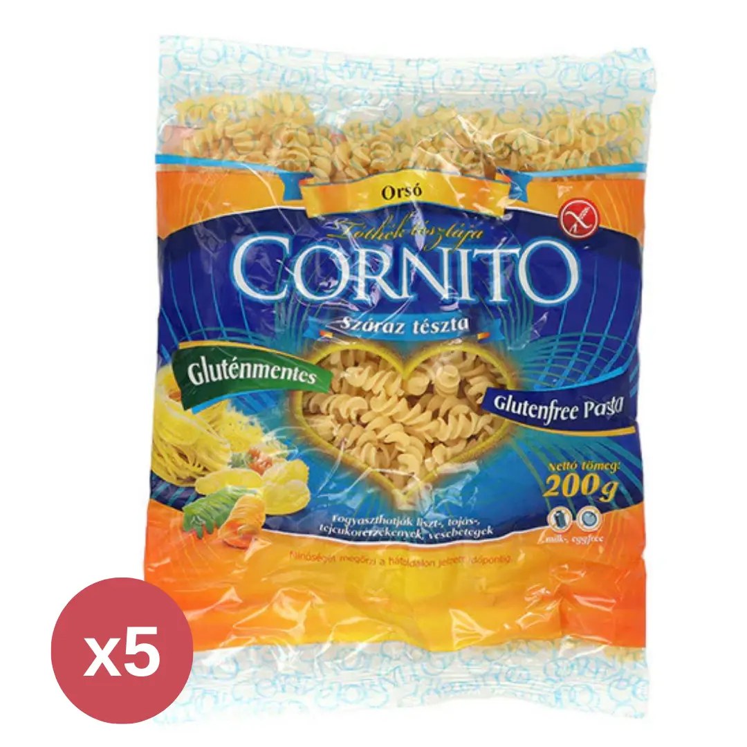 A Cornito Gluténmentes Száraztészta Orsó 5×200 g többdarabos kiszerelésben érhető el, amely egy csomagajánlat keretében kínál nagyobb mennyiséget egyszerre.