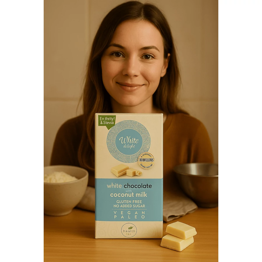 A White Delight Kókusztejes fehércsokoládé krémes, selymes állagú, prémium minőségű csokoládé alternatíva. Paleo és vegán összetevőkből készült, glutén-, tojás- és szójamentes. Nem tartalmaz hozzáadott cukrot, édes ízét az eritrit biztosítja, amelyet kizárólag magas minőségű csokoládékhoz alkalmaznak. A Dia-Wellness White Delight Kókusztejes fehércsokoládé tökéletes választás mindazoknak, akik élvezni szeretnék az édes ízeket tudatos étrendjük részeként.