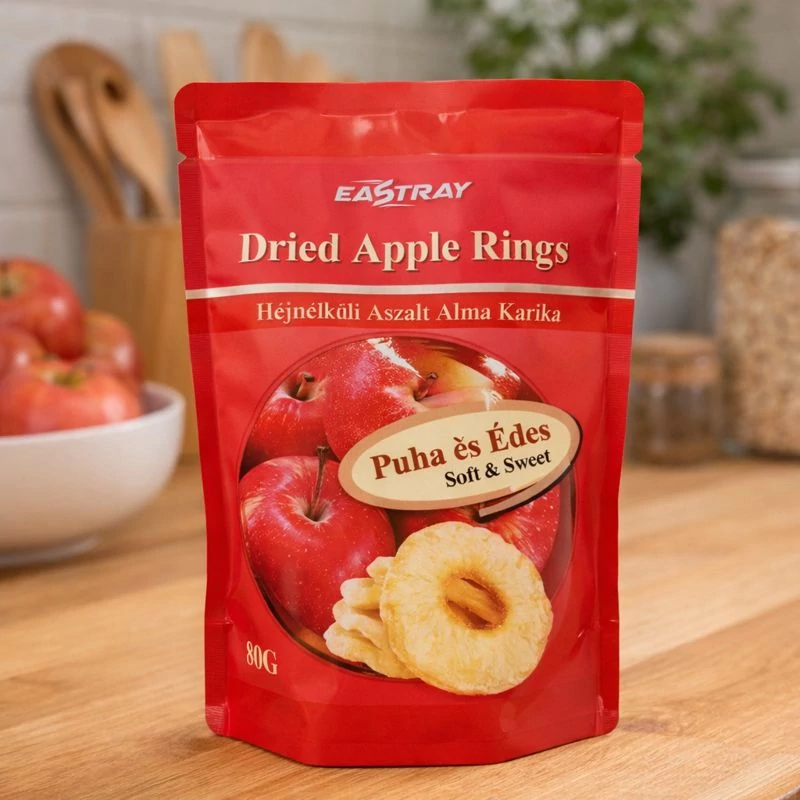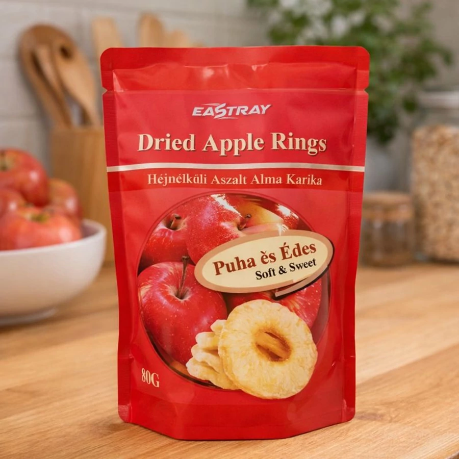 Az Eastray Héjnélküli aszalt alma karika 80 g természetes módon készült, puha és kellemesen édes gyümölcssnack. A gondosan válogatott almák héj nélkül kerülnek feldolgozásra, majd kíméletesen aszalják őket, hogy megőrizzék természetes ízüket és aromájukat.