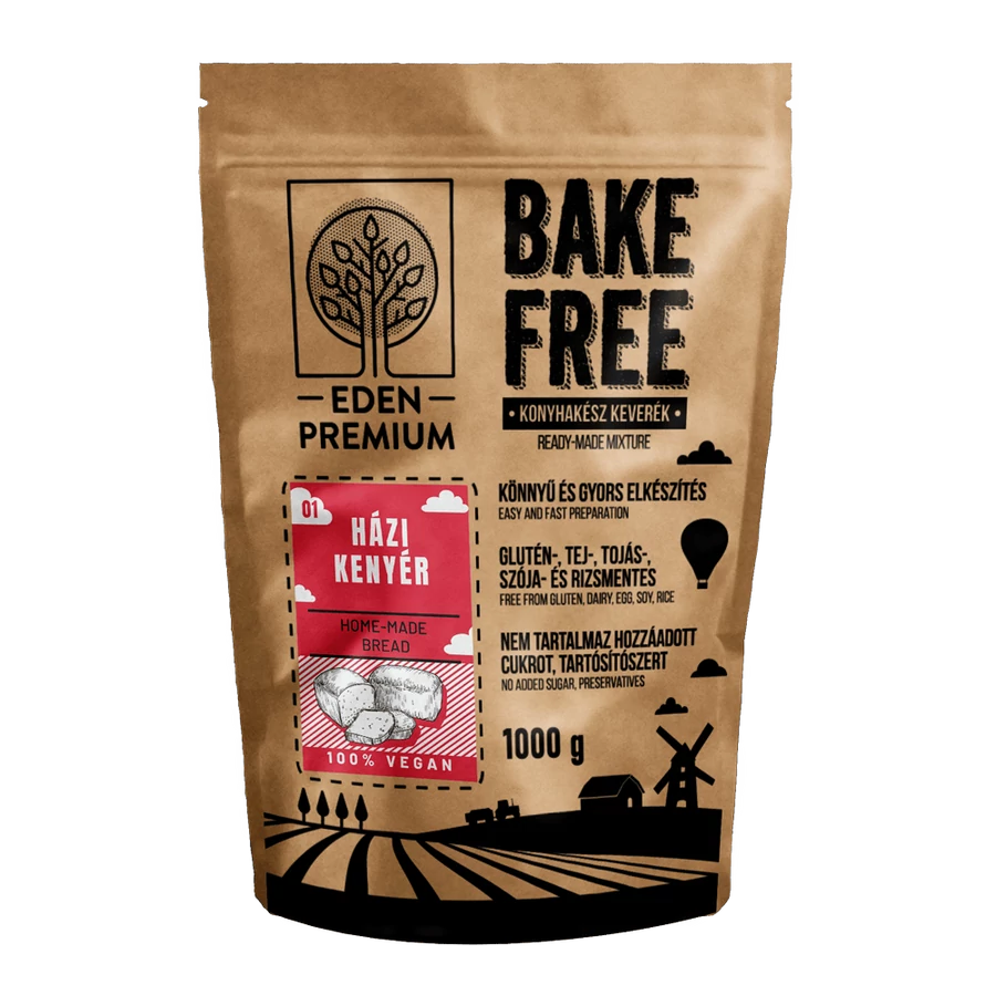 A Bake-Free házi kenyér lisztkeverékből glutén-, tej-, tojás-, szója-, élesztő-, kukorica-, burgonya- és rizsmentes, vegán, élelmi rostban gazdag, hozzáadott zsiradék nélküli kenyerek és péksütemények készíthetőek gyorsan és egyszerűen.