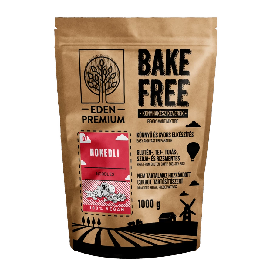A Bake-Free nokedli lisztkeverékből glutén-, tej-, tojás-, szója-, élesztő-, kukorica-, burgonya- és rizsmentes, vegán, élelmi rostban gazdag, hozzáadott zsiradék nélküli nokedli készíthető gyorsan és egyszerűen.