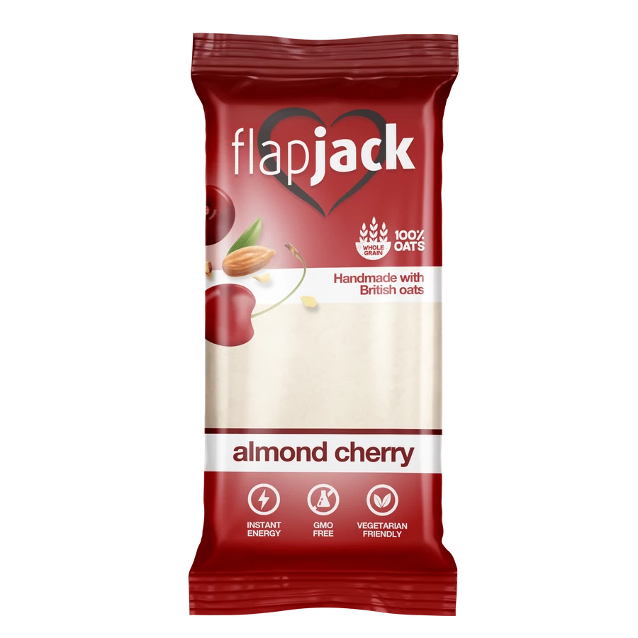 Flapjack Meggyízű mandulás zabszelet kandírozott cseresznyedarabokkal, fehér bevonóba mártva 100 g
