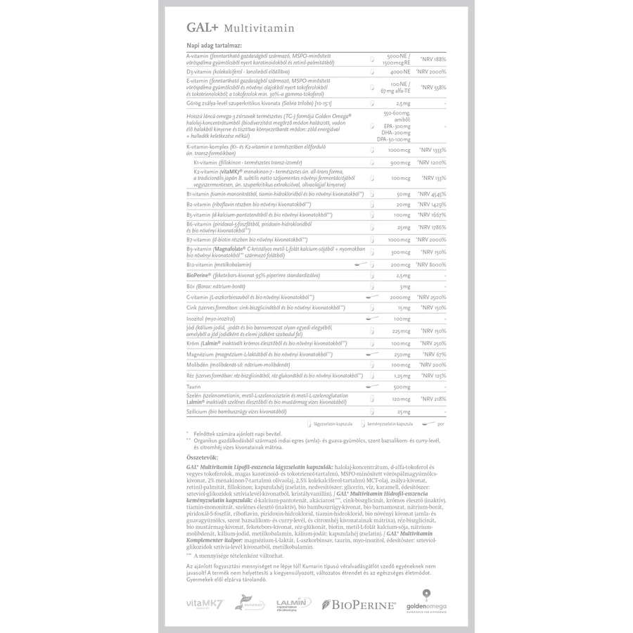 A GAL+ Multivitamin termékünket a legújabb kutatások fényében fejlesztettük ki, szem előtt tartva a természetességet és életszerűséget, hogy minden vitamint, ásványianyagot, nyomelemet ideális formában, mennyiségben és arányban tartalmazzon, nem eltérve attól, ahogyan ezekhez állandó tápanyagdús, változatos táplálkozással juthatnánk. Ahol előnyös, a vitaminok és ásványok részben organikus termesztésből származó (bio) gyógy- és fűszernövények kivonatából származnak. A mennyiségek esetében végig fontosnak tartottuk, hogy a napi adag biztosan tartalmazza a hatásosnak talált dózist, de semmi esetre se lépje túl az életszerű mennyiségeket, azaz azt a mennyiséget, amit táplálkozással már nem is lehetne fedezni sehogyan sem. Emellett rendkívül fontos, hogy a gondosan válogatott alapanyagok mellett ne lábatlankodjék semmi, ami nem odavaló. A termékünkben ilyesminek nyomát sem találja.