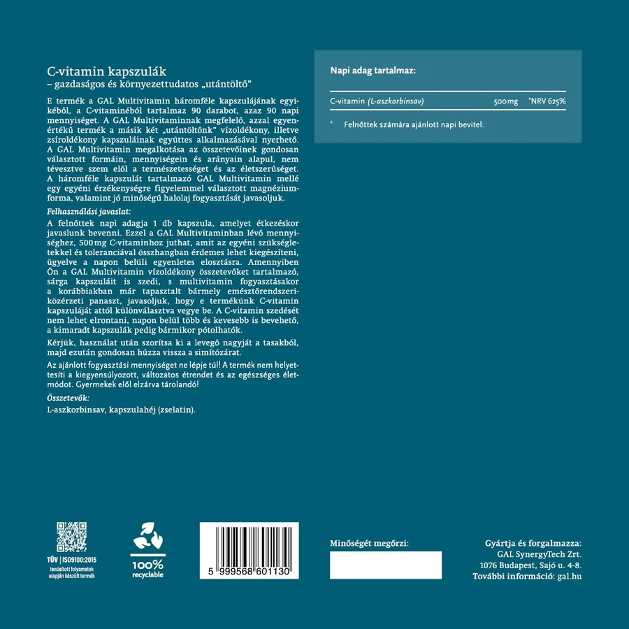 A GAL Multivitamin termékünket a legújabb kutatások fényében fejlesztettük ki, szem előtt tartva a természetességet és életszerűséget, hogy minden vitamint, ásványianyagot, nyomelemet ideális formában, mennyiségben és arányban tartalmazzon, nem eltérve attól, ahogyan ezekhez állandó tápanyagdús, változatos táplálkozással juthatnánk. Ahol előnyös, a vitaminok és ásványok részben organikus termesztésből származó (bio) gyógy- és fűszernövények kivonatából származnak. A mennyiségek esetében végig fontosnak tartottuk, hogy a napi adag biztosan tartalmazza a hatásosnak talált dózist, de semmi esetre se lépje túl az életszerű mennyiségeket, azaz azt a mennyiséget, amit táplálkozással már nem is lehetne fedezni sehogyan sem. Emellett rendkívül fontos, hogy a gondosan válogatott alapanyagok mellett ne lábatlankodjék semmi, ami nem odavaló. A termékünkben ilyesminek nyomát sem találja.