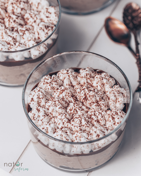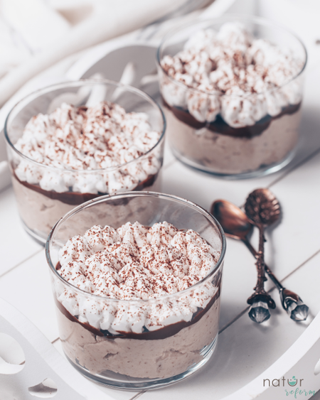 A (kiolvadt) gesztenyemasszát a kb. 120 ml kókuszkrémmel, a rum aromával és 1 ek. négyszeres erősségű édesítővel alaposan összekeverjük. A maradék kb. 80 ml hideg kókuszkrémet 1 ek. eritrittel kemény habbá verjük. A gesztenyés krémünket 3 pohárkában eloszlatjuk és mindegyik tetejére teszünk 2-2 tk. mogyorókrémet, amit egy kanállal elegyengetünk. A felvert kókuszkrémet habzsák segítségével a pohárkrémek tetején eloszlatjuk. Érdemes legalább 1 órára a hűtőbe tenni az elkészült desszertek, fogyasztás előtt pedig egy pici holland kakaóporral megszórni a tetejüket.