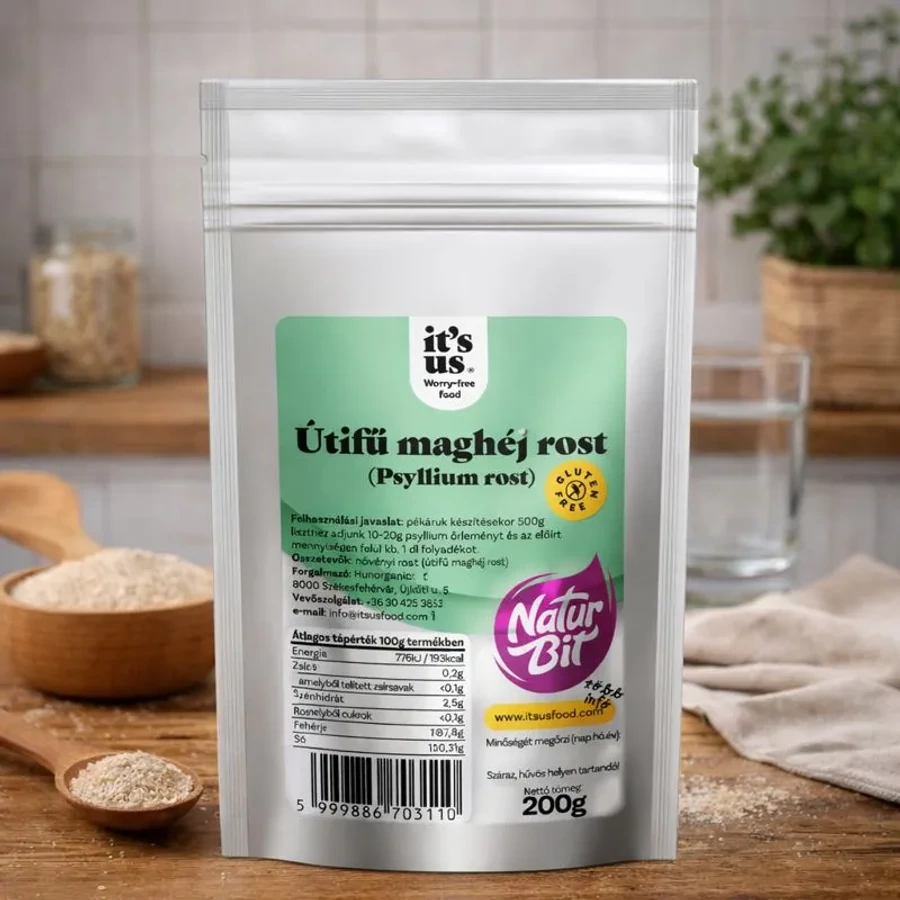 Az It’s us Útifű maghéj rost kínáló 10×200 g 100% tisztaságú psylliumhéj-őrleményt tartalmaz, kiemelkedően magas, 87,8 g/100 g rosttartalommal. Glutén-, tej-, tojás- és szójamentes, vegán étrendbe is beilleszthető. A vízben oldódó rost folyadék hatására gélt képez, ami segítheti az emésztés egyensúlyát, a teltségérzet kialakulását és a bélflóra működését. Gluténmentes és reform sütésnél javítja a tészták szerkezetét, rugalmasabb, kevésbé morzsálódó kenyeret és péksüteményt eredményez. A 10 darabos kínáló kiszerelés ideális intenzív felhasználásra vagy viszonteladásra.