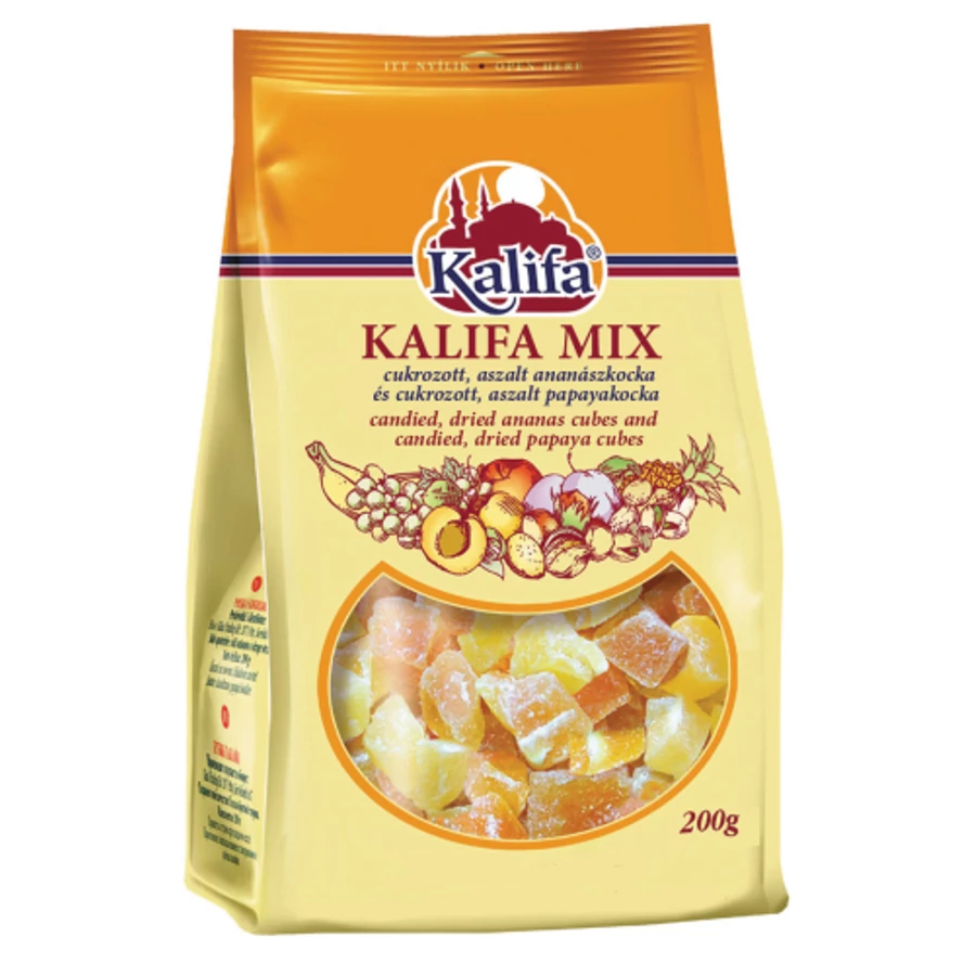 A Kalifa mix kandírozott ananászkocka és papayakocka keveréke. Önmagában is kiváló csemege, de süteményben is nagyon finom.