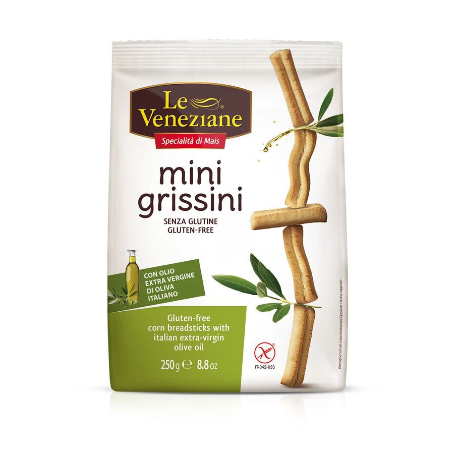 A Le Veneziane gluténmentes mini grissini a ropogtatnivalók szerelmeseinek tökéletes választás. Ezek a vékony és könnyű pálcikák gluténmentes kukoricából készülnek, így ideálisak azok számára, akik gluténérzékenységgel vagy gluténmentes étrendet követnek. A mini grissinik kellemesen roppanósak és ízletesek, így kiválóan alkalmazkodnak minden nassolási pillanathoz. Akár önmagukban fogyasztod őket, akár mártogatósokhoz vagy szendvicsek mellé kínálod, a Le Veneziane gluténmentes mini grissini tökéletes kiegészítője lesz az egészséges és ízletes étrendednek.