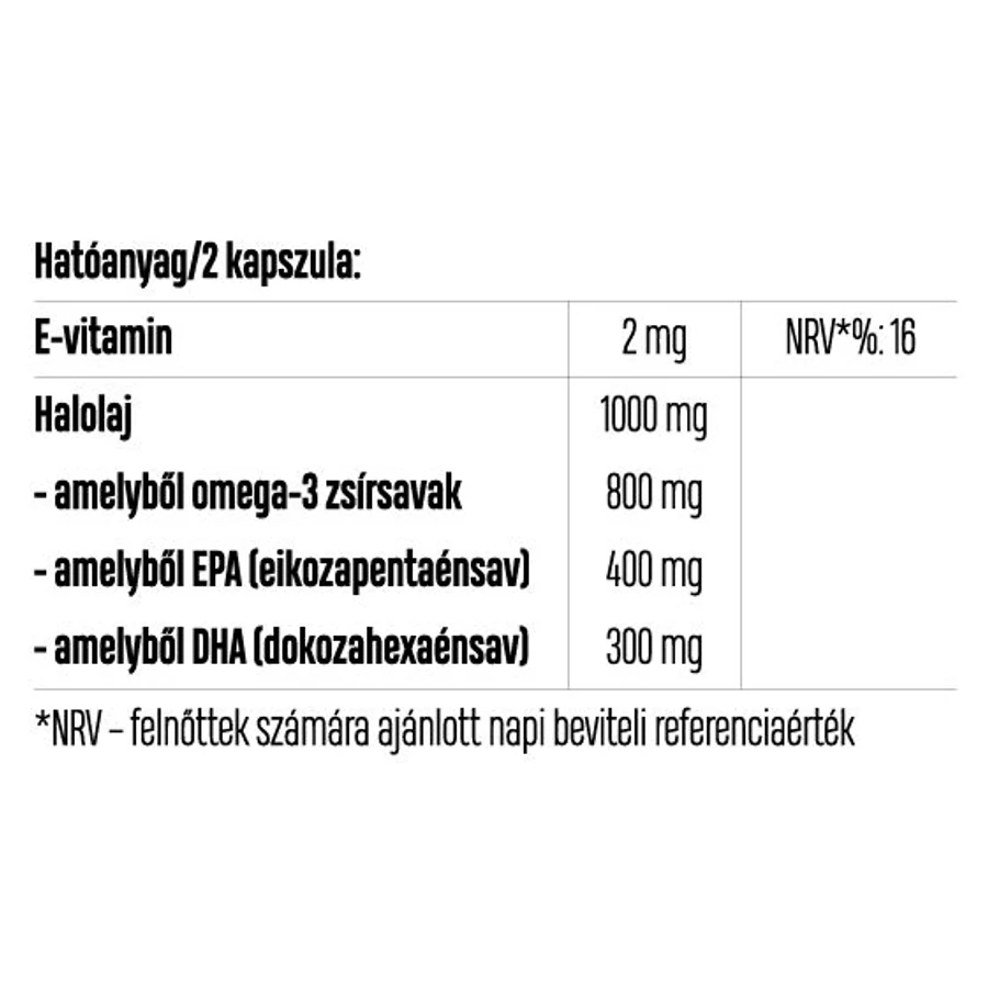Összetevők: halolaj készítmény (halolaj omega-3 zsírsav tartalommal, antioxidáns: tokoferolban gazdag kivonat); kapszulahéj [zselatin, nedvesítőszer: glicerin, tisztított víz], D,L-alfa-tokoferol.