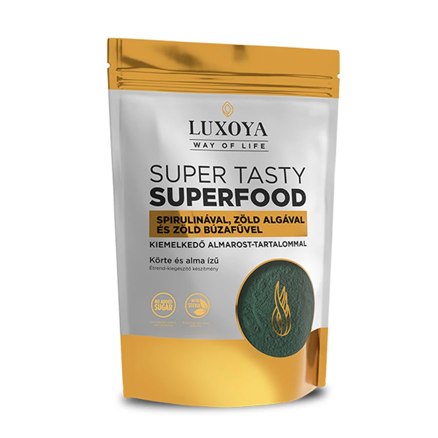 SUPER TASTY SUPERFOOD - KÖRTE-ALMA ÍZESÍTÉSŰ SPIRULINÁT, ZÖLD ALGÁT ÉS ZÖLD BÚZAFÜVET TARTALMAZÓ ÉTREND-KIEGÉSZÍTŐ ITALPOR 300 g