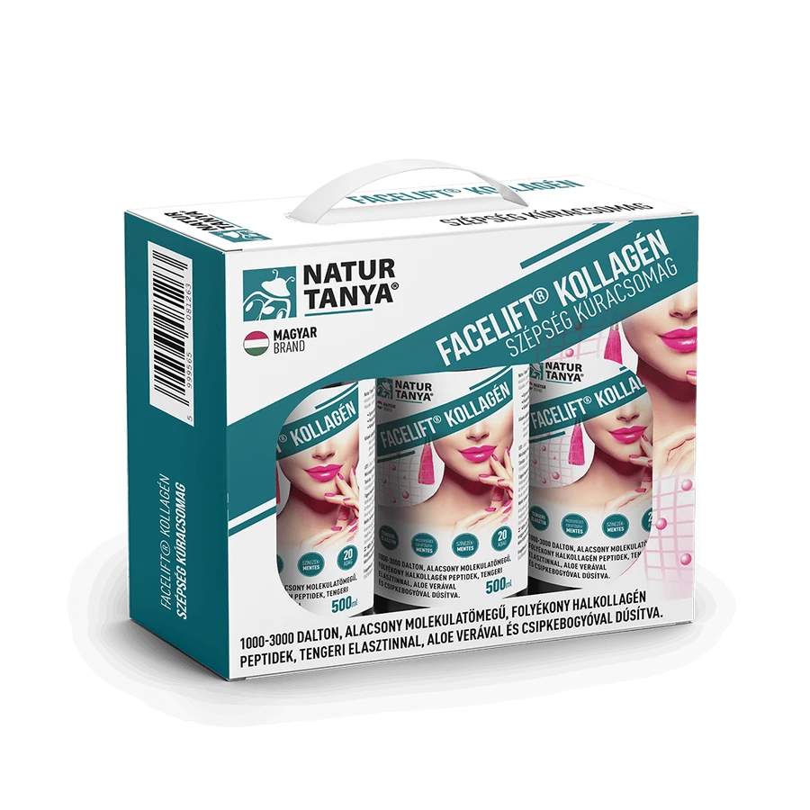 A 60 napos szépség kúracsomag, 3 palack szabadalommal védett, folyékony halkollagén koncentrátumot tartalmaz, tengeri elasztinnal, csipkebogyóval és Aloéval. A Natur Tanya® FACELIFT® KOLLAGÉN előemésztett halkollagén peptidjei, az alacsony molekulatömegnek (1000-3000 Dalton), és a likvid formának köszönhetően, gyorsan hasznosítható kollagént biztosítanak a szervezet számára. Termékünk Prolastin® összetevője, tisztított, hidrolizált elasztin, amelyet halak (tőkehal fajtákból és lepényhalból) bőréből enzimatikus hidrolízissel vonnak ki. A Prolastin® elasztin egy olyan rugalmas összetevő, amelynek molekulatömege 1400 Da. A halkollagént és elasztin a még jobb élettani tulajdonságokért csipkebogyó és Aloe kivonatokkal is dúsítottuk.
