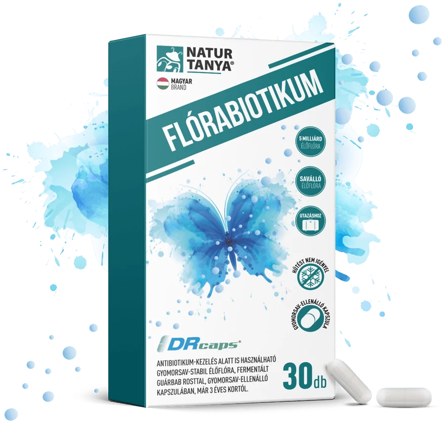 A Natur Tanya® FLÓRABIOTIKUM nemzetközi törzsgyűjteménybe letétbe helyezett probiotikum és szabadalommal védett, fermentált prebiotikum a gyomor-bélrendszer egészségéhez, a bélmikrobiom egyensúlyához, puffadások és hasmenések ellen, már 3 éves kortól. A gyomorsav-stabil élőflóra és a fermentált guárbab rost különösen ajánlott antibiotikum-kezelés alatt vagy után, és kiváló társ (tengerentúli) utazásokhoz.