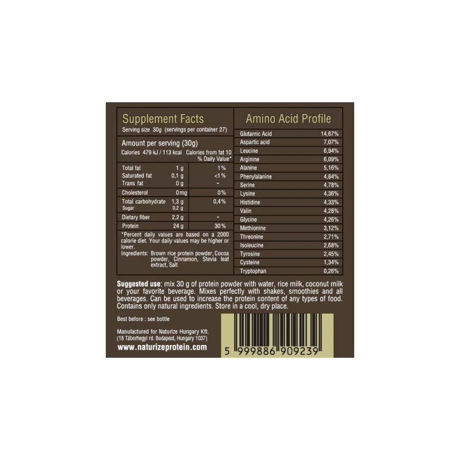 A fahéjas fekete csoki ízesítésű Naturize® is kizárólag természetes összetevőket tartalmaz, prémium barnarizs-fehérjeport, UTZ kakaóport, nagy tisztaságú Ceyloni fahéjat, egy kevés Stevia levél kivonatot és pár szem Himalája sót. Gluténmentes, tejet, laktózt, szóját, aszpartamot, állati eredetű összetevőt nem tartalmaz.