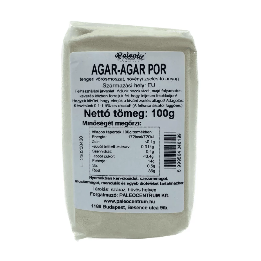 A Paleolit Agar-agar por 100 g természetes, növényi eredetű zselésítő anyag, melyet tengeri vörösmoszatból állítanak elő. Gluténmentes és vegán alternatíva az állati eredetű zselatin helyett. Alacsony hőmérsékleten is zselésedik, hőálló, íztelen és szagtalan, így desszertek, pudingok, zselék, szörpök és sós ételek készítéséhez ideális. Rosttartalma támogatja az egészséges bélműködést.