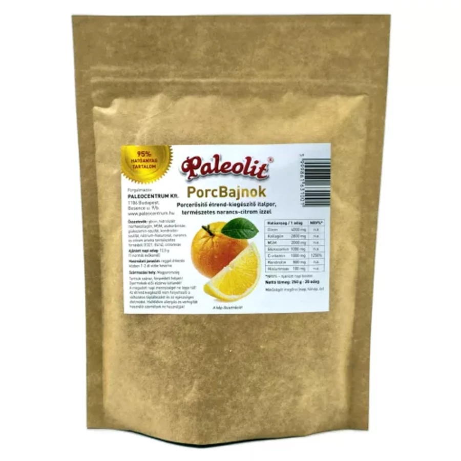 A PorcBajnok MSM+Kollagén italpor narancsos-citromos ízben készült porcerősítő formula, mely támogatja az ízületek, porcok és csontok egészségét. Hidrolizált kollagént, MSM-et, C-vitamint és egyéb hasznos összetevőket tartalmaz. Rendszeres fogyasztása segíthet a mozgékonyság megőrzésében, ízületi panaszok enyhítésében. Praktikus, 250 g-os kiszerelésben.