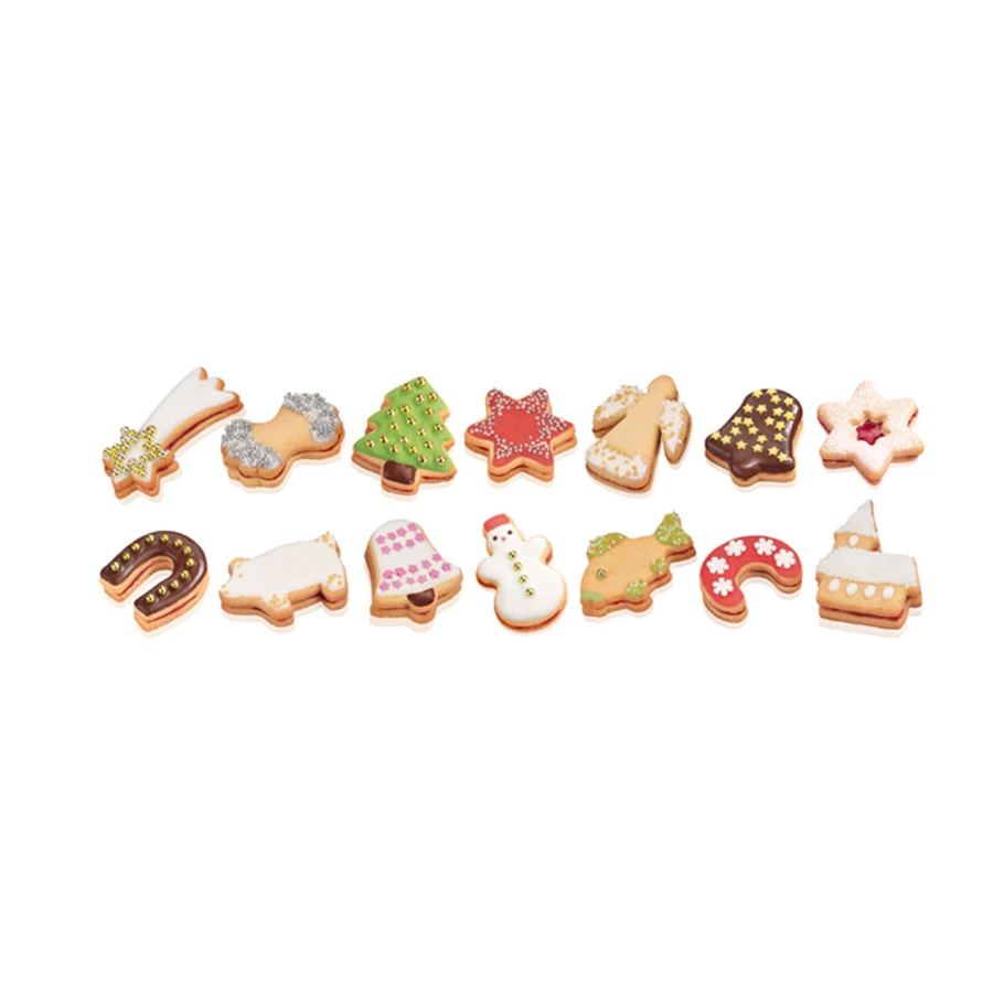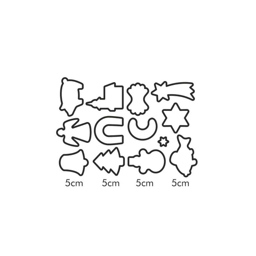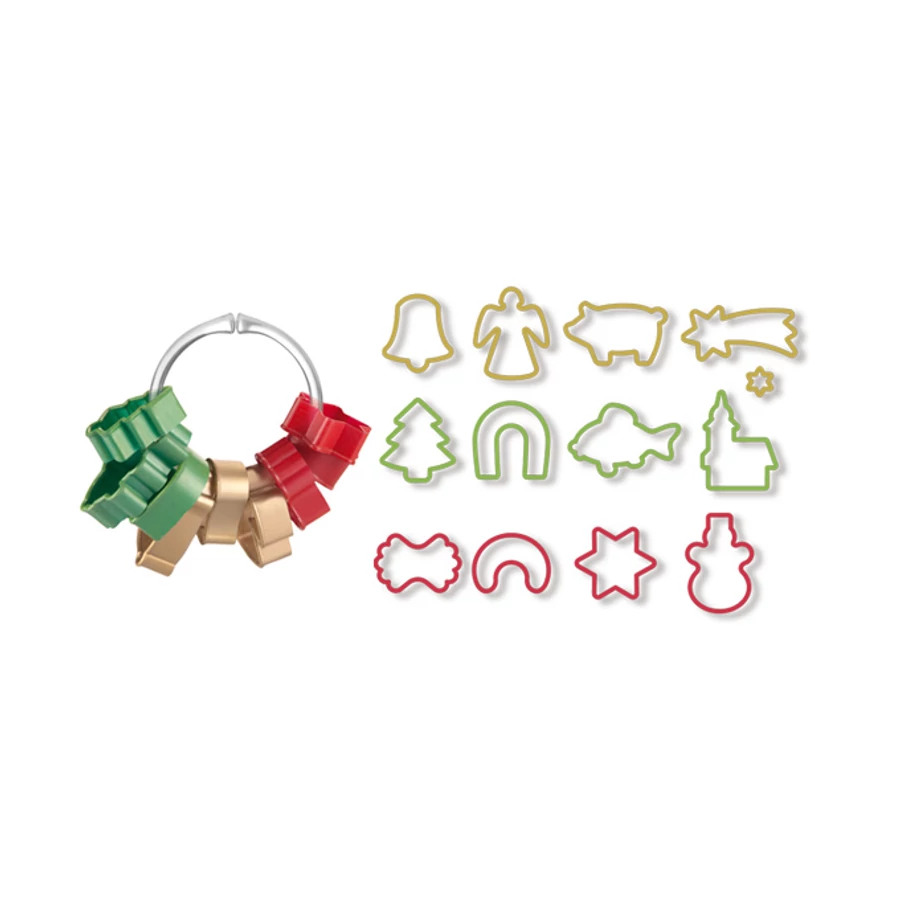 Kiválóan alkalmas karácsonyi sütemény kivágására, 13 kiszúrót tartalmaz, gyűrűn elhelyezve a könnyű raktározáshoz. Első osztályú ellenálló műanyagból készült, mosogatógépben mosható. 3 év garancia.