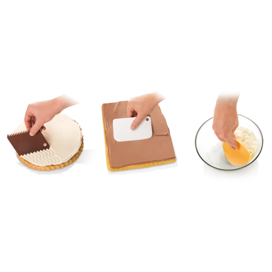 Rugalmas kenőecset, mely kiválóan alkalmas gömbölyű formákban és tálakban való kenésre, kemény kenőecset a felületek egyenletes kenéséhez és fogazott ecset a mázak, kenőkrémek és has. díszítésére. Első osztályú műanyagból készült, karikával ellátva a felakasztáshoz. Mosogatógépben mosható. 3 év garancia.