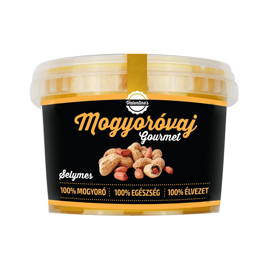 A Valentine’s Mogyoróvaj 100%-ban földimogyoróból készült prémium mogyoróvaj. A magvakat száraz pörkölési technológiával pirítják meg, ezért nincs szükség plusz olajra. Nem tartalmaz semmilyen más hozzáadott adalékanyagot, sót és cukrot sem, kizárólag 100% földimogyorót. A mogyoró Argentínából érkezik, és itt Magyarországon dolgozzák fel. A frissen pörkölt földimogyoró ezután őrléssen megy keresztül, így páratlan, zamatos és friss íz világgal rendelkezik. Több lépcsős folyamatban egyre finomabbra őrlik, ezért semmilyen más mogyoróvajhoz sem hasonlítható állagot és íz élményt érnek el. Lágyságát leginkább a mézhez tudnánk hasonlítani. A mogyoró a vékony, barna héj nélkül kerül feldolgozásra így elkerülik a kellemetlen, kesernyés, avas ízt, melyet biztosan te is tapasztalhattál korábban, más gyártó termékénél. A Valentine’s Mogyoróvaj páratlan, pazar ízével garantáltan nem okoz csalódást.