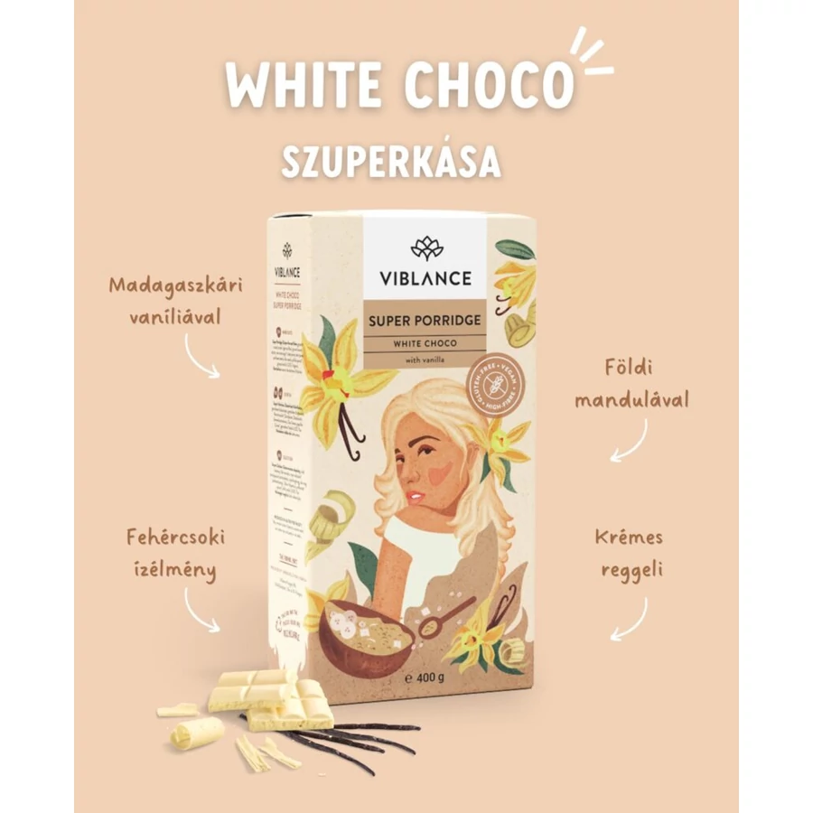 "Mi lenne ha azt mondanánk: egy tál krémes fehércsoki ízű zabkása lehetne a holnapi reggelid? És ahhoz mit szólnál, ha a fehércsokoládé ízélményét tej nélkül is élvezhetnéd? Igazán finom vegán fehércsokit nehéz találni, megcsinálni pedig még annál is nehezebb. Ezért úgy döntöttünk tovább gondoljuk az eredeti fehércsoki fogalmát, és megpróbáljuk az összetevőit egy kásába pakolni, ami aztán meleg vízzel vagy növényi itallal felöntve a krémes fehércsokoládé ízélményét adja. Hogy még izgalmasabb legyen, adtunk hozzá egy csipet madagaszkári vaníliát, földi mandulát és tápláló superfoodokat, az édességéért pedig egy különleges nádcukor és a datolya felel. És bár ez a zabkása nem a hivatalos fehércsokival készül, büszkén üdvözüljük a többi Viblance Szuperkásánk között, mert brutál finom lett…"