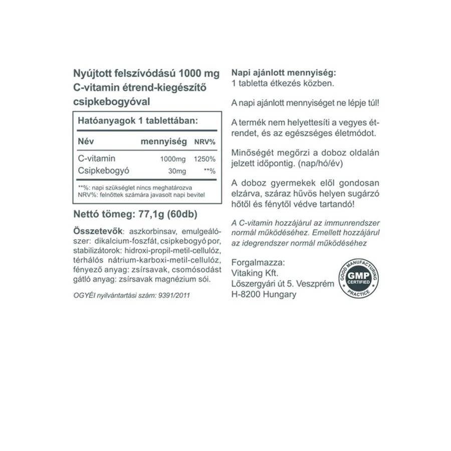 Folyamatos felszívódású Vitaking C-vitamin, tehát segíthet biztosítani az egész napos megfelelő C-vitamin ellátottságot. Tablettánként 1000 mg C-vitamint és 30 mg csipkebogyót tartalmaz. A csipkebogyó jelentős C-vitamin forrás, és állítólag hasznos, ha a C-vitaminnal együtt fogyasztjuk. Fontos tudni, hogy nem csak az immunrendszer normál működéséhez járul hozzá, hanem támogatja például az idegrendszer működését, és hozzájárul a normál kollagén képződéshez is.
