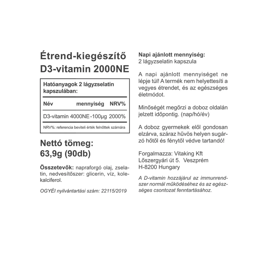 Ez a Vitaking D-vitamin gélkapszulánként 2000NE (50 microgramm) D-vitamint tartalmaz.